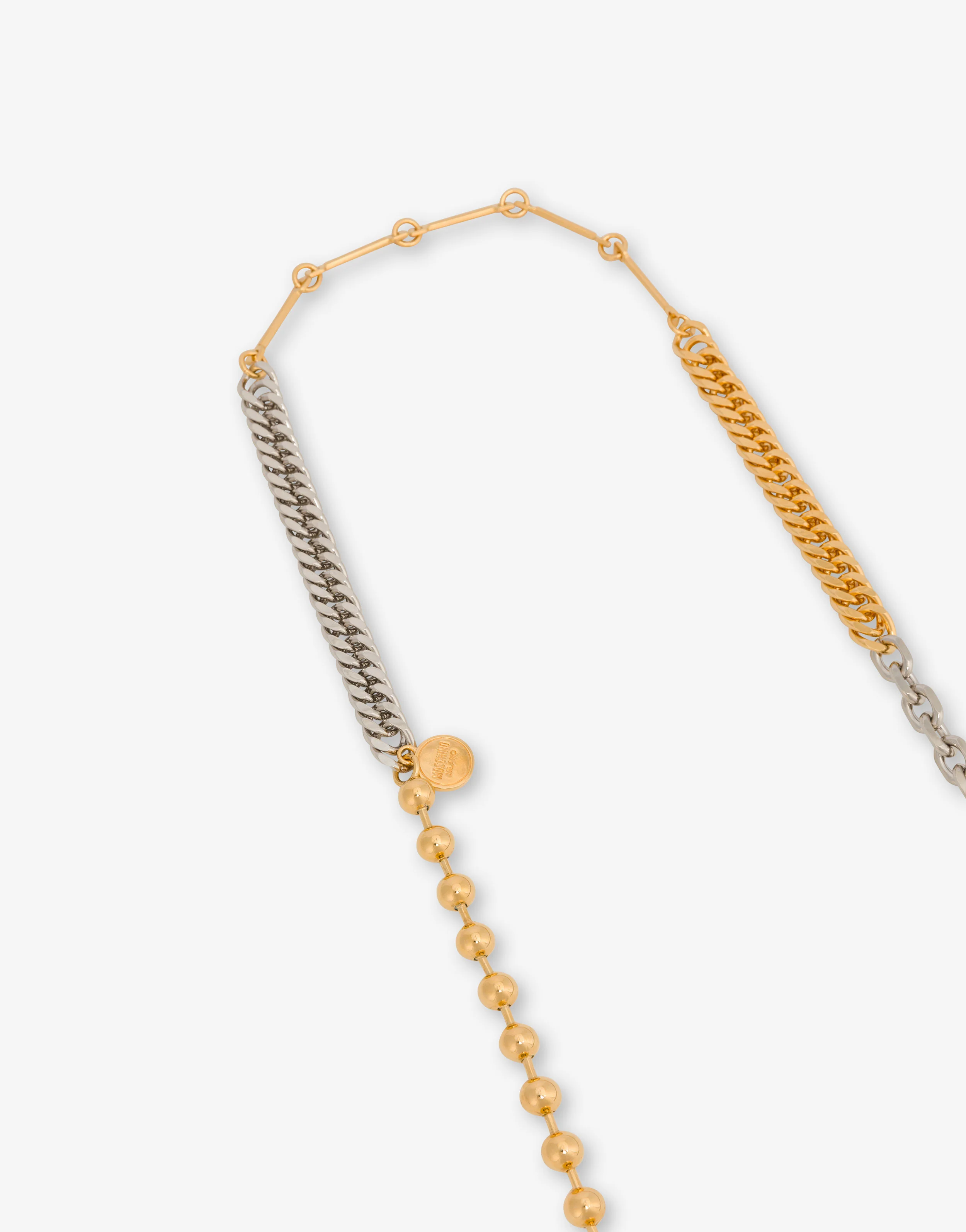 Shoulder strap made from a combination of four distinctive chains: a diamond-cut chain, an elegant 'snake' chain in two finishes, a playful chain adorned with beads, and a sophisticated elongated link chain. Designed as a unique and eye-catching alternati