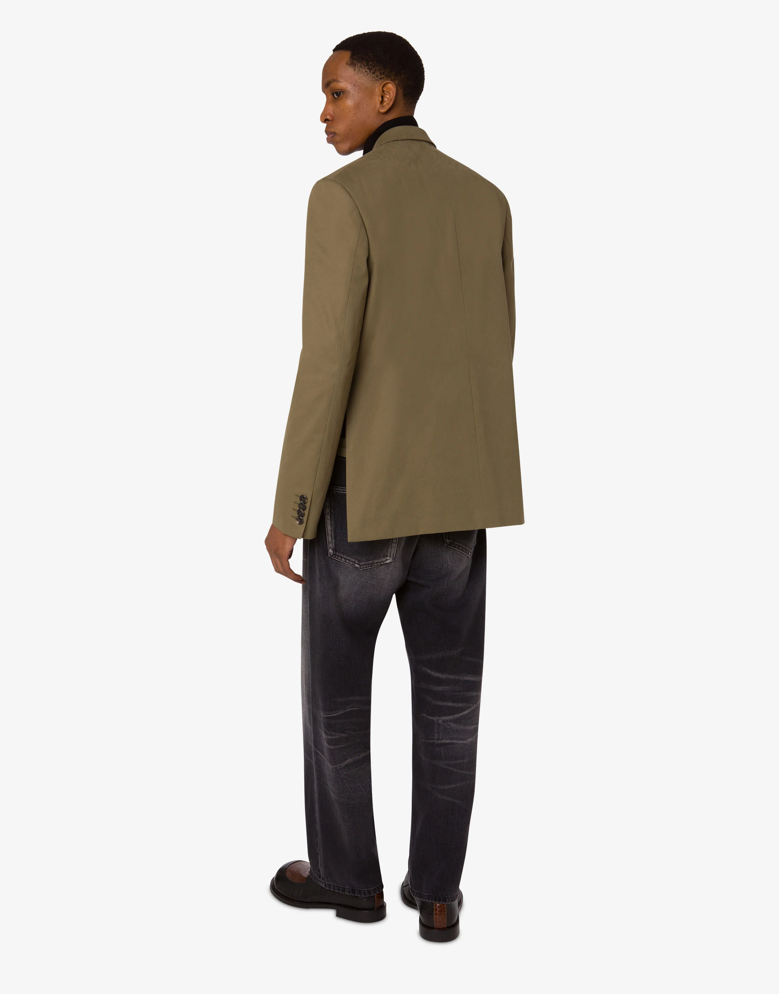 The fall/winter 2025 collection features the single-breasted diagonal cotton jacket with suede gloves applied to the front with the function of pockets.