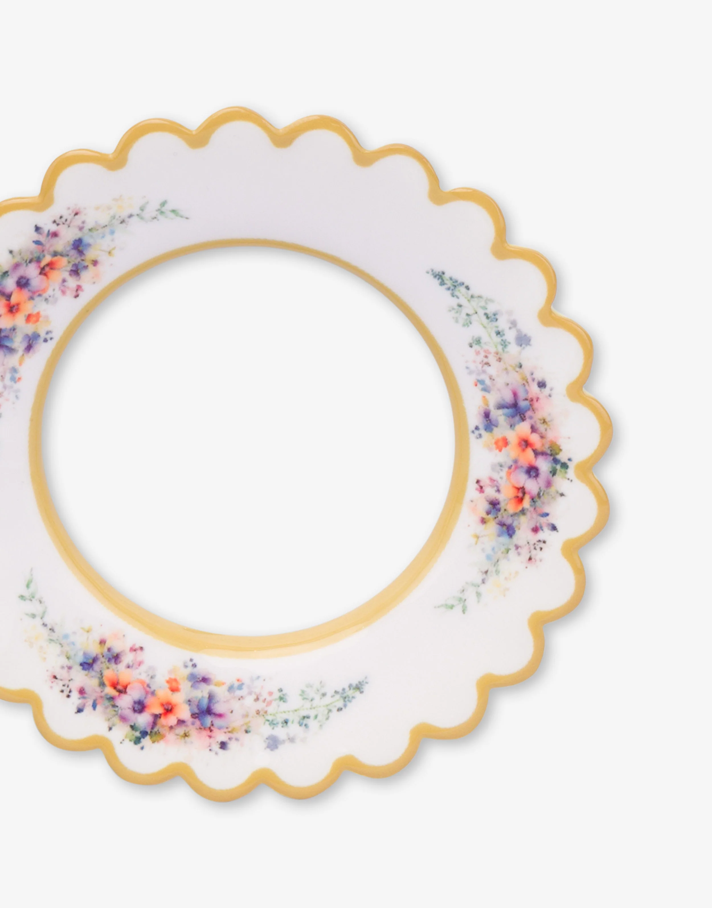 The Fall/Winter 2025 pre-collection features a metal bracelet inspired by a small tea plate, with a floral print and scalloped outer edge.