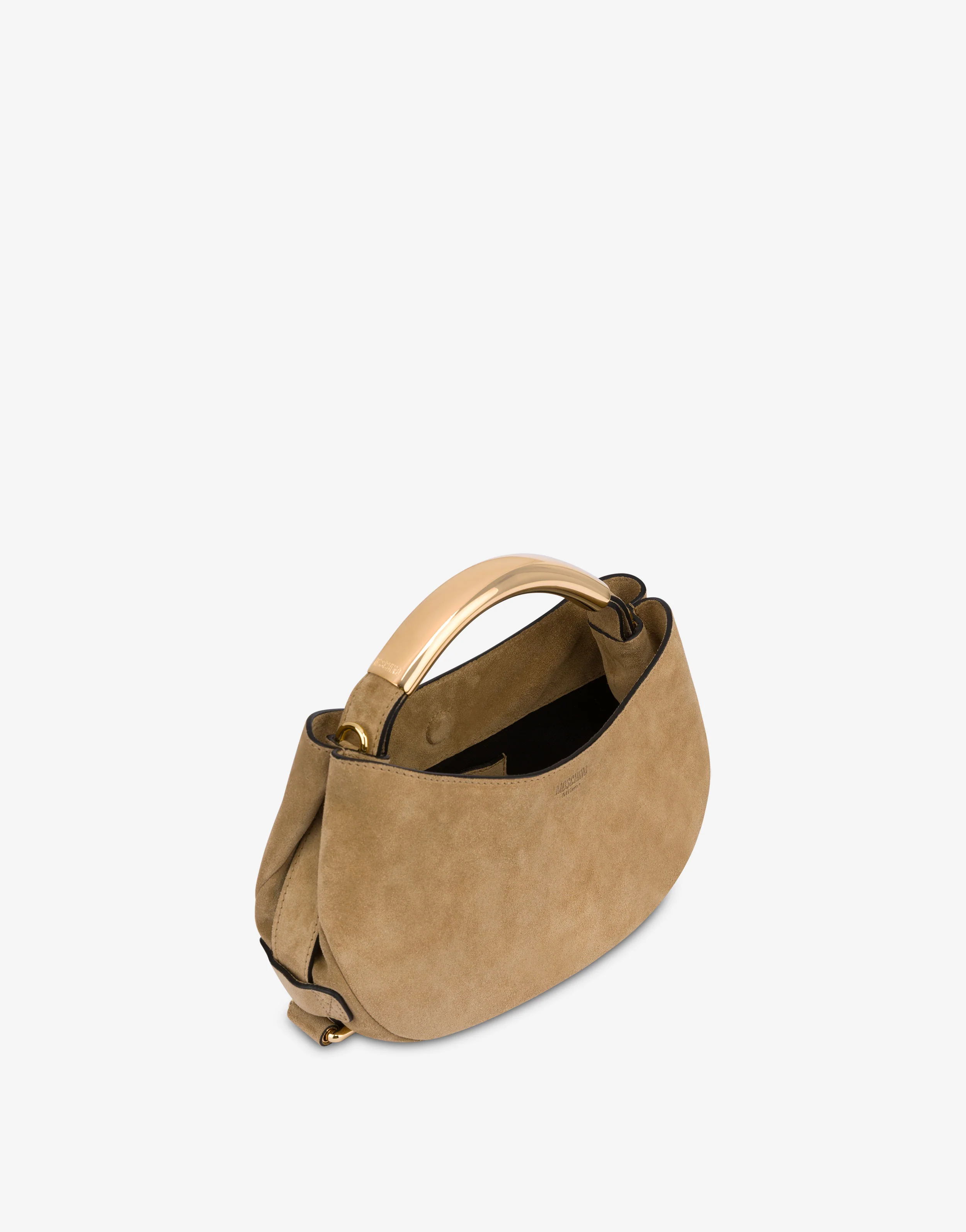 Small hobo bag in suede, soft and very lightweight. The tubular metal handle creates a unique and captivating design with refined elegance, and the adjustable belt wrapping around the bag is highlighted by the Lettering logo interwoven in the design. Available exclusively online.