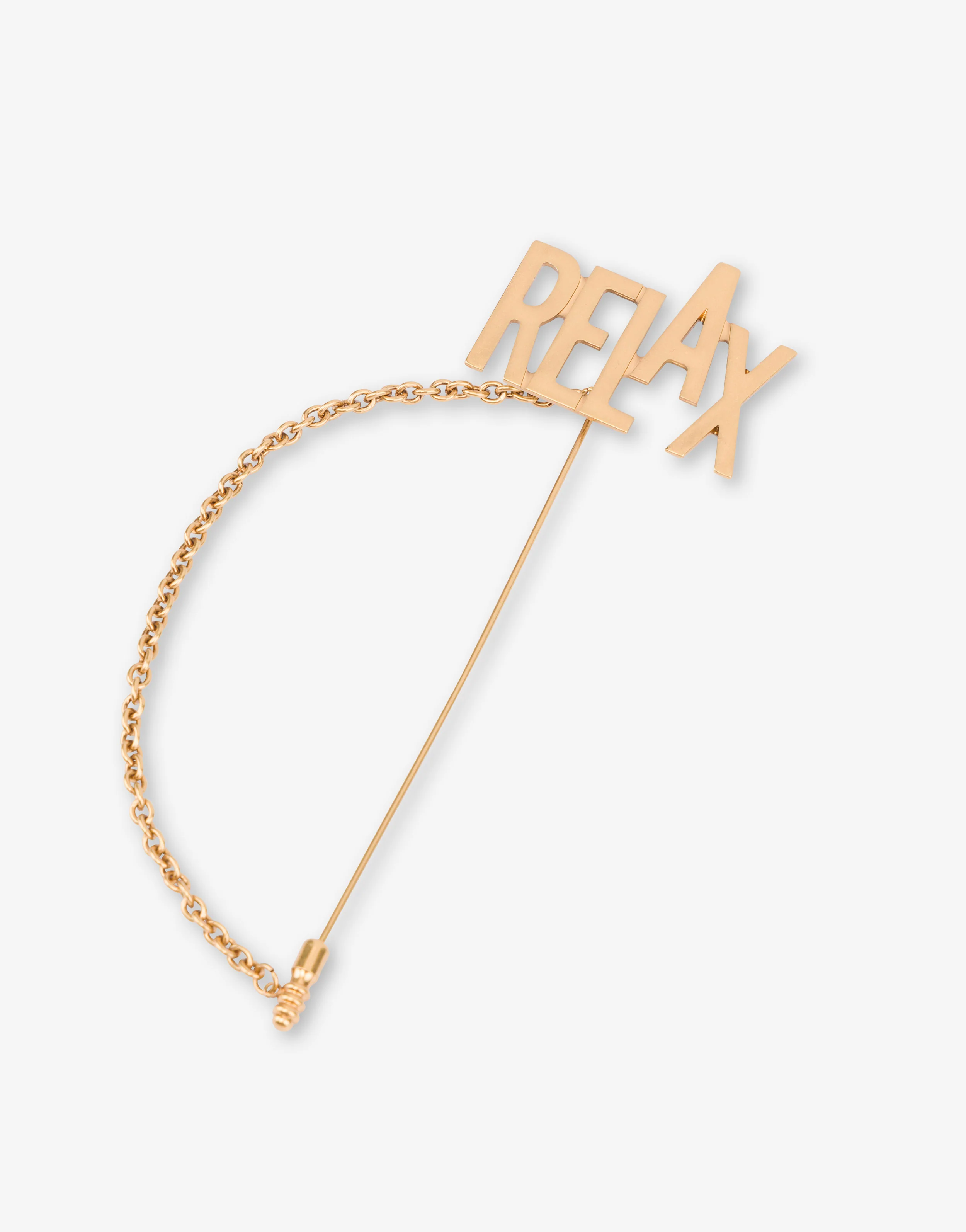 Brooch with a thin chain and RELAX lettering in gold galvanic.