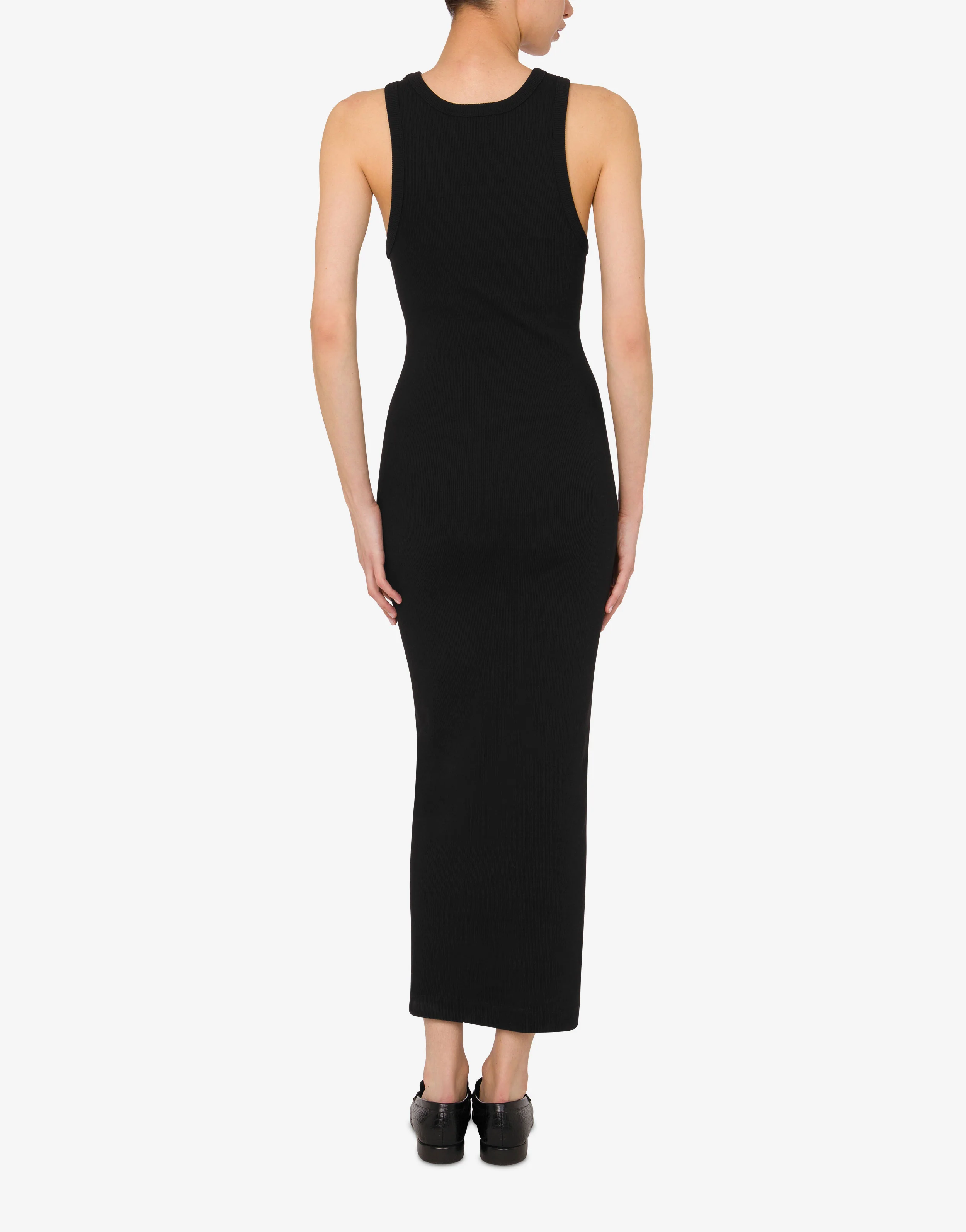 The Autumn/Winter 2025 collection presents a long stretch cotton dress with ribbed detailing and logo print on the front.