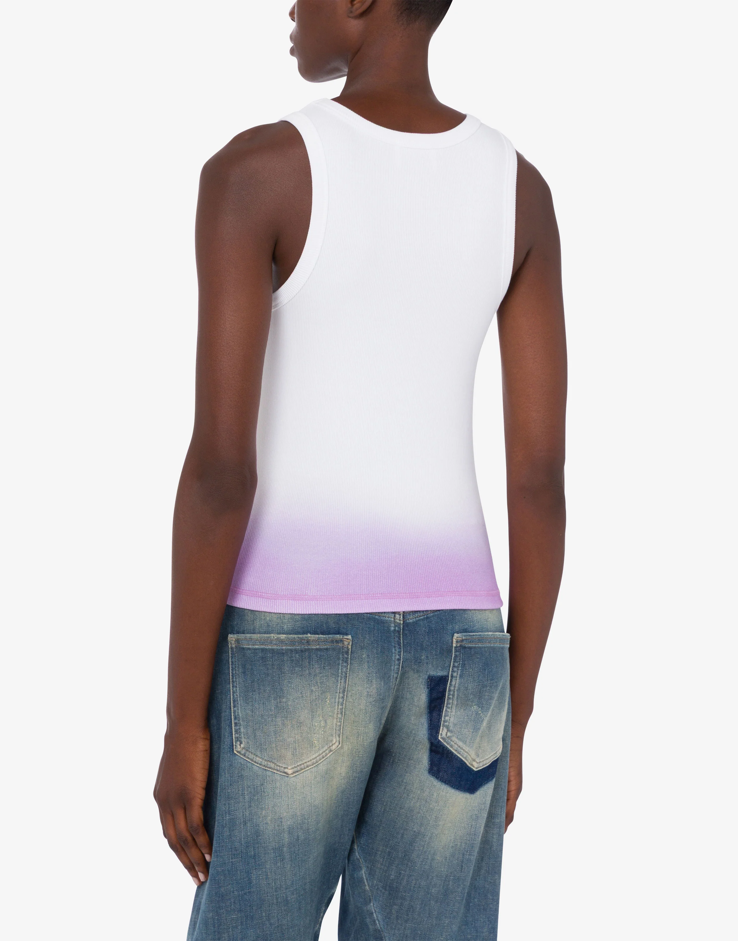 The Spring/Summer 2026 collection features a stretch cotton ribbed top with a small logo patch embroidery on the front and contrasting shading at the bottom.