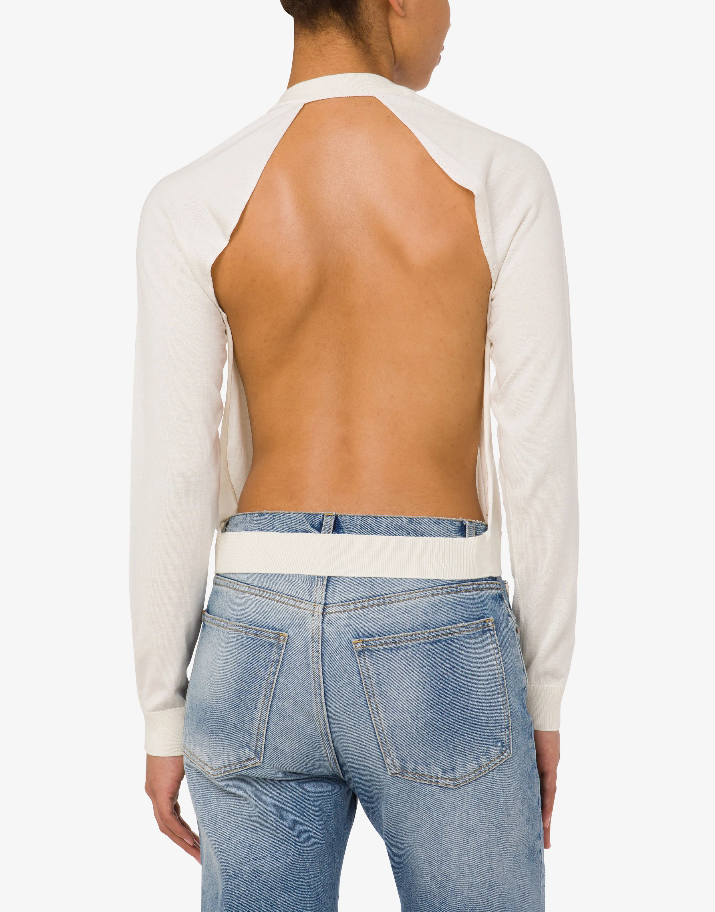 Fine wool and silk jumper with maxi cut-out at the back, buttons at the front, and small Moschino letter M in gold-tone galvanised metal.